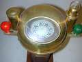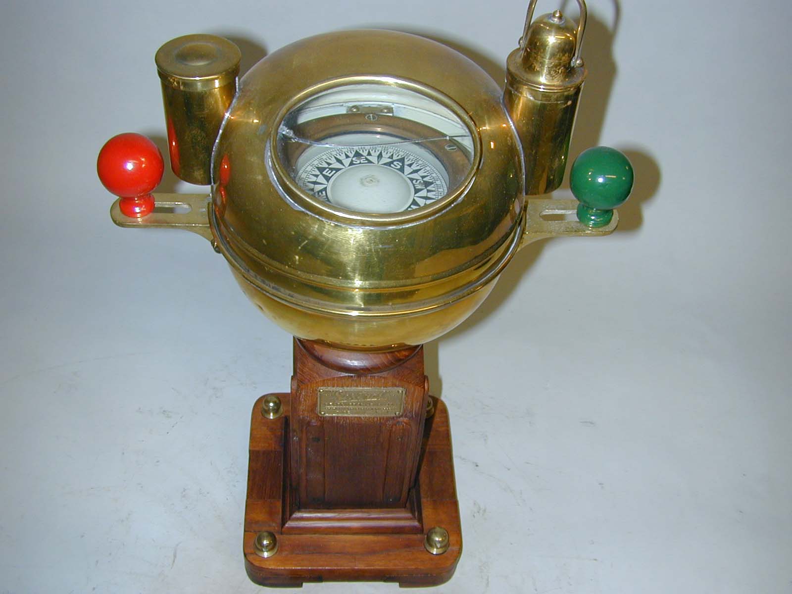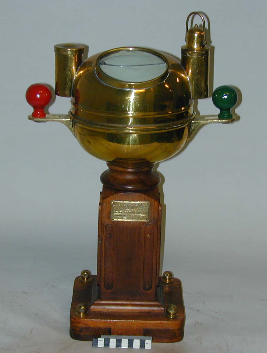 Beskrivelse: Messinghus med flydende kompas og to små lampehuse samt rød og grøn knop. Alt monteret på træsøjle og bundplade med fire messingknopper. Træsøjlens højde er 29 cm, bundplades areal 20 x 20 cm.