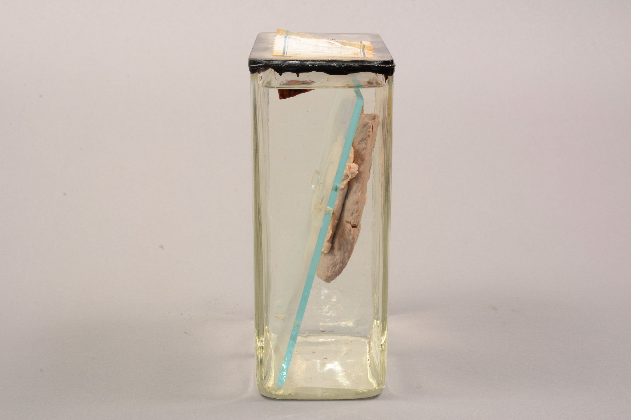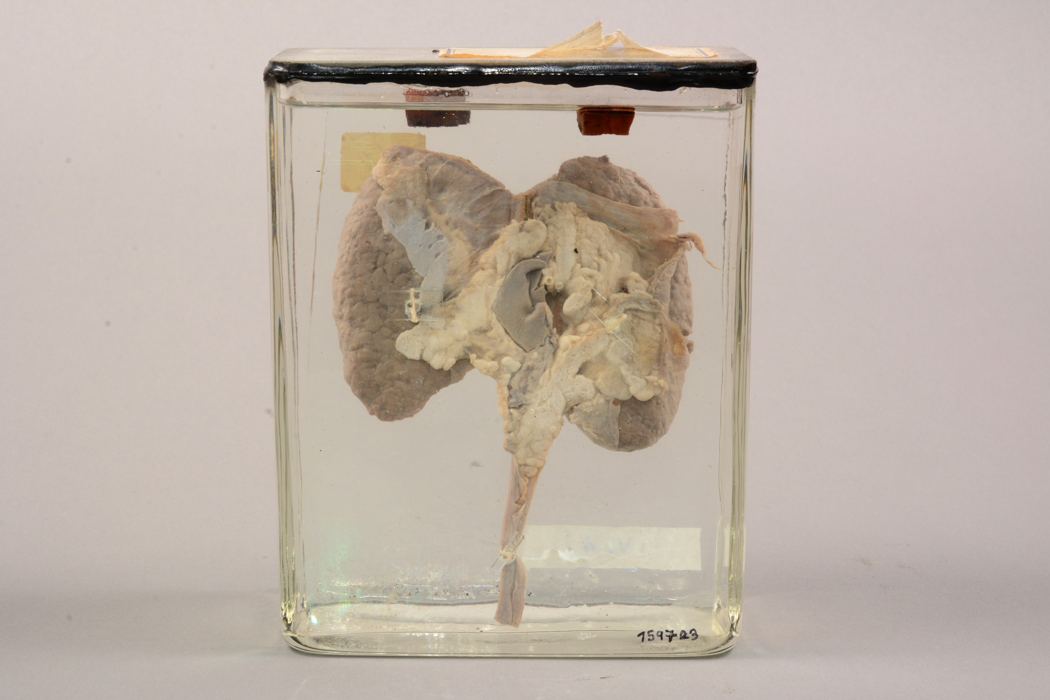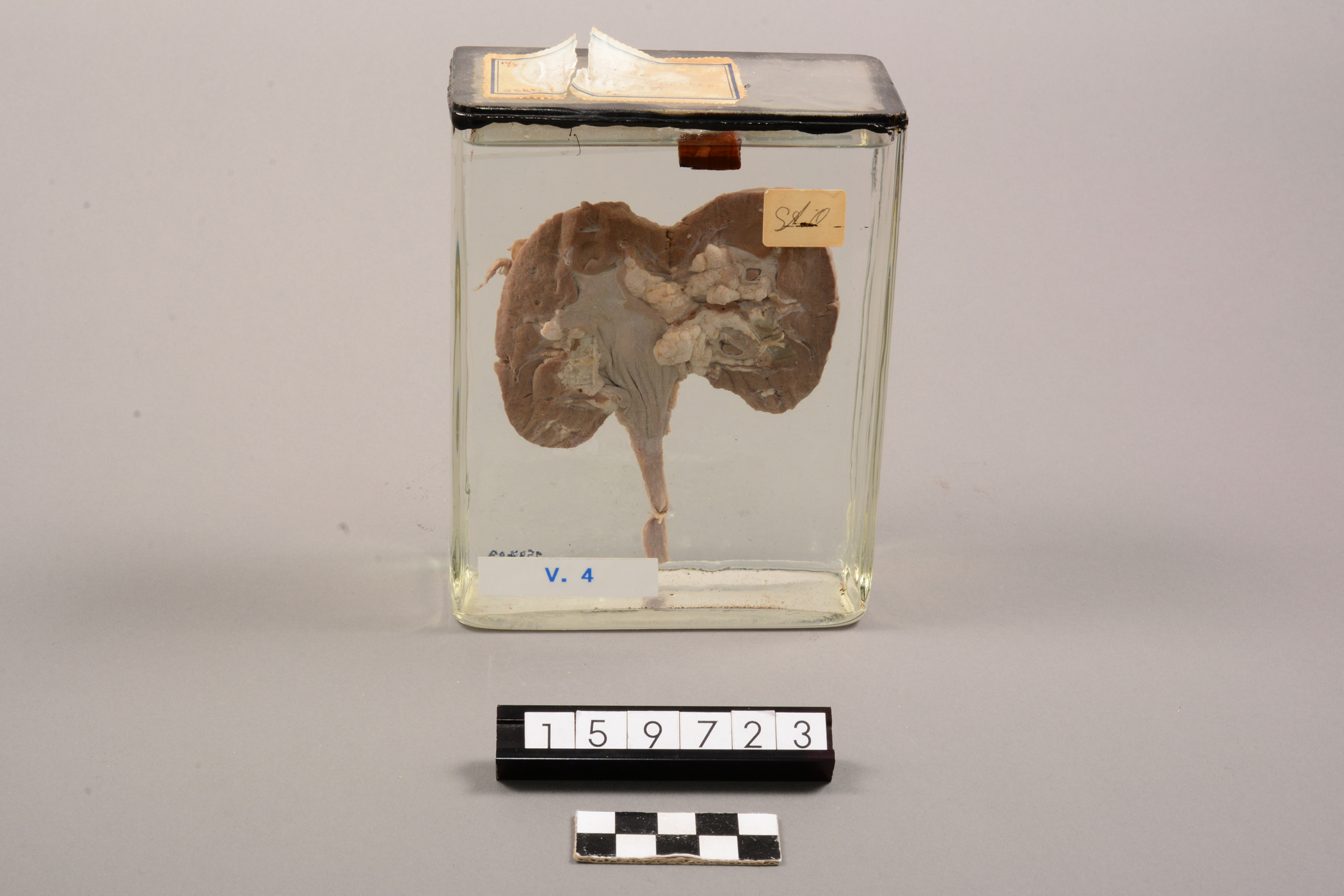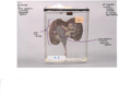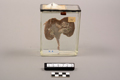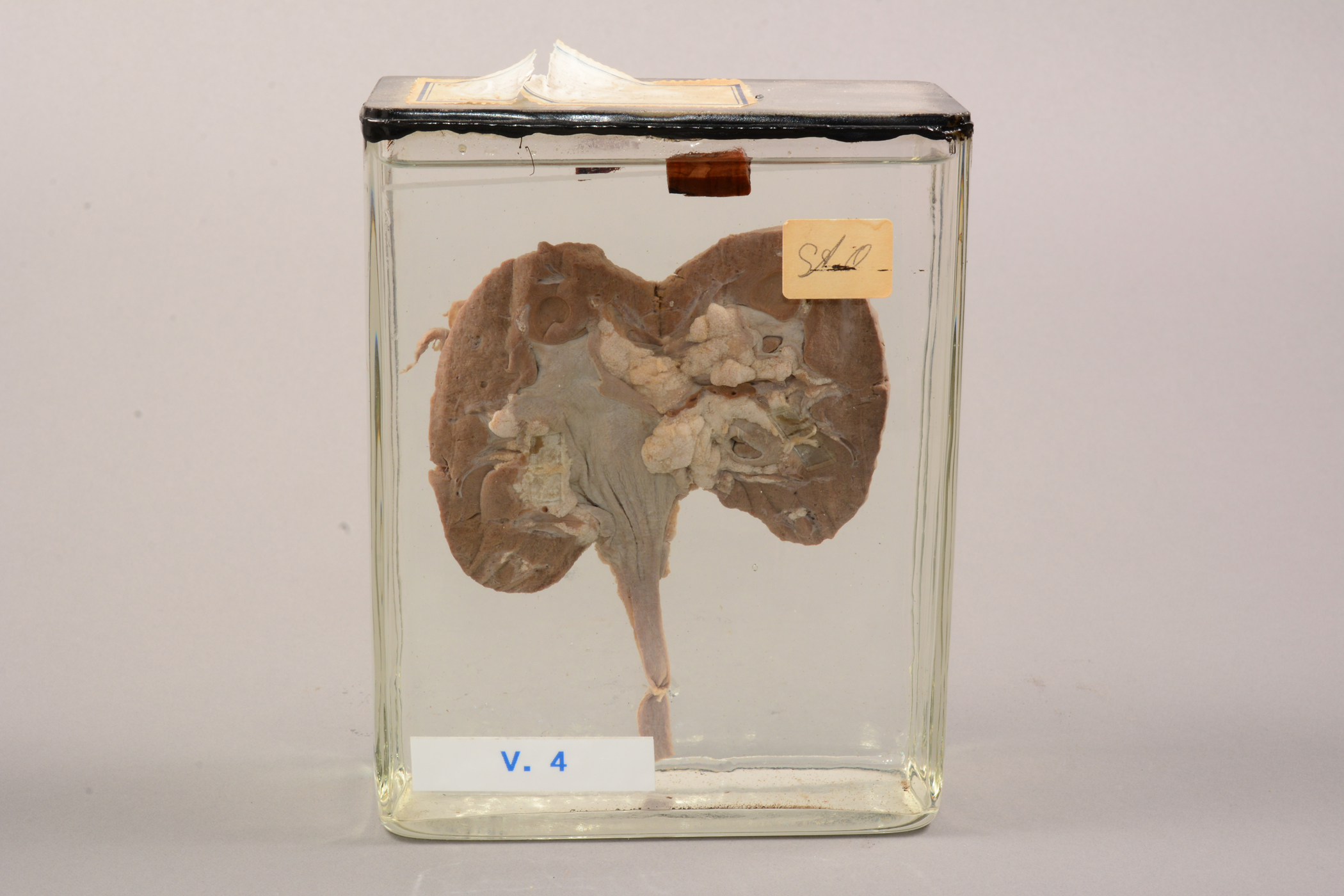 Beskrivelse: Nyrepræparatet er placeret i en glasbeholder i størrelsen 15 x 12 x 6,5 cm. I denne beholder er nyrepræparatet fastsat med 2 hvide snore, 2 hvide perler og 2 gennemsigtige plastikstykker. Præparatet er fikseret, hvilket vil sige, at man har stoppet nedbrydelsesprocesserne ved at anvende fiksativer som f.eks. formaldehyd (Patologisk Institut har anvendt 4 % formalinopløsning). Beholderen er fyldt med sprit. Præparatnummer fra registrant kaldet "Museumspræparater" fra Patologisk Institut: Lymfo-retikulære system, blod, knoglemarv V 4.