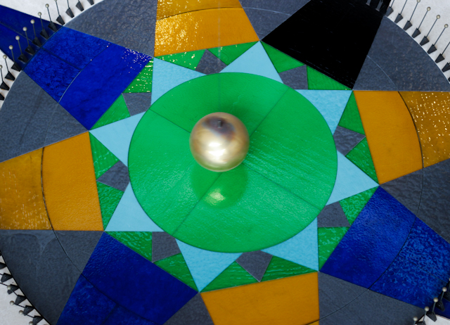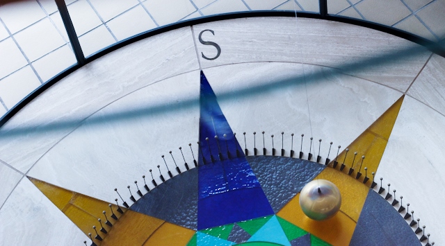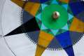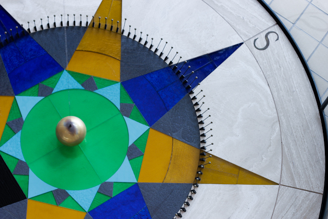 Beskrivelse: Stålkugle belagt med 15 my 24 karat guld, ophængt i 0,7 mm wire. Kuglen svinger over kompasrose udformet i glasmosaik af kunstneren Niels Winkel. I cirkelform i kompasrosen står 120 vippestænger af messing. Under vippepindene ligger en elektromagnet og en føler er anbragt i vindrosens centrum. Når pendulet passerer føleren, tændes der for strømmen i elektromagneten. Det derved dannede magnetfelt trækker kuglen ud langs radius og kompenserer for energitab ved vindmodstand m.v. Pendulet flytter sig fra en stang til den næste på ca. 15 min. På Århus’ breddegrad flytter pendulet sig ca. 12,50° i timen svarende til ca. 29 timer for en hel omdrejning. Pendulet samt kompasrosen er specielt fremstillet som kunstnerisk udsmykning til Steno Museet. Museet blev indviet 25/3/1994.