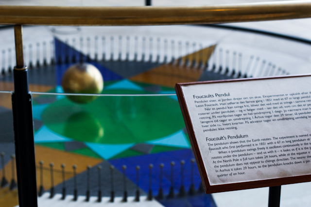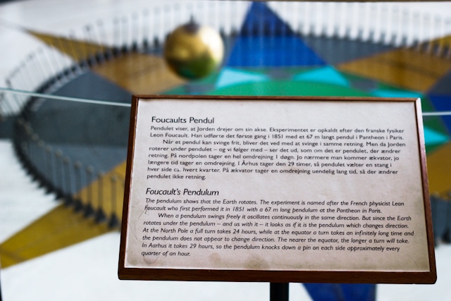 Uddybende oplysninger: Midt i Steno Museets smukke foyer kan man se en version af den franske fysiker Leon Foucaults (1819 - 68) berømte pendulforsøg. Med dette forsøg viste Foucault i 1851 på en enkel og elegant måde, at jorden virkeligt drejer om sin egen akse. Derved bekræftede han eksperimentelt en antagelse, man havde haft i et par hundrede år. Inden da havde man i stedet forestillet sig, at det var hele universet, der drejede omkring den hvilende jord. Foucault lavede sine første forsøg i laboratoriet med et pendul på 2 meter og derefter en imponerende demonstration i Pantheon i Paris med et pendul på 67 meter. Steno Museets pendul er kun på 11 m. Til gengæld bliver det holdt i gang af magnetiske impulser fra en spole i gulvet, så det kan svinge uophørligt. Forklaringen på forsøget er, at et frit ophængt pendul bestandigt vil svinge i samme plan. Jordkloden drejer imidlertid om sin akse under pendulet, og da vi følger med denne drejning, ser det ud som om, det er pendulet der flytter sig. Hvis forsøget udføres på nordpolen, tager en hel omdrejning 24 timer. Jo tættere man er på ækvator, jo længere tid tager en omdrejning. På Århus' breddegrad tager det ca. 29 timer for en hel omdrejning. Lige på ækvator tager det uendelig lang tid, dvs. der er ingen drejning. http://www.stenomuseet.dk/foucault.htm
