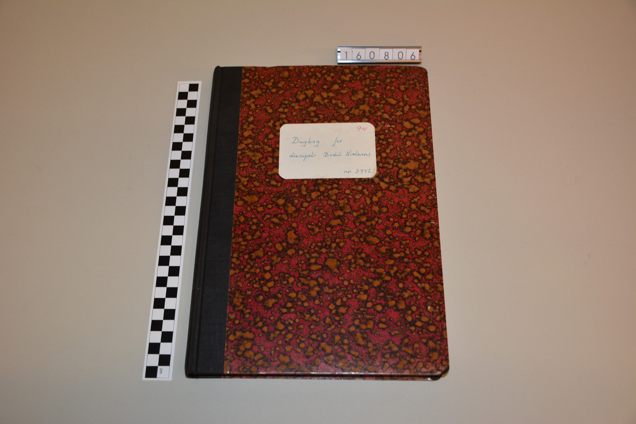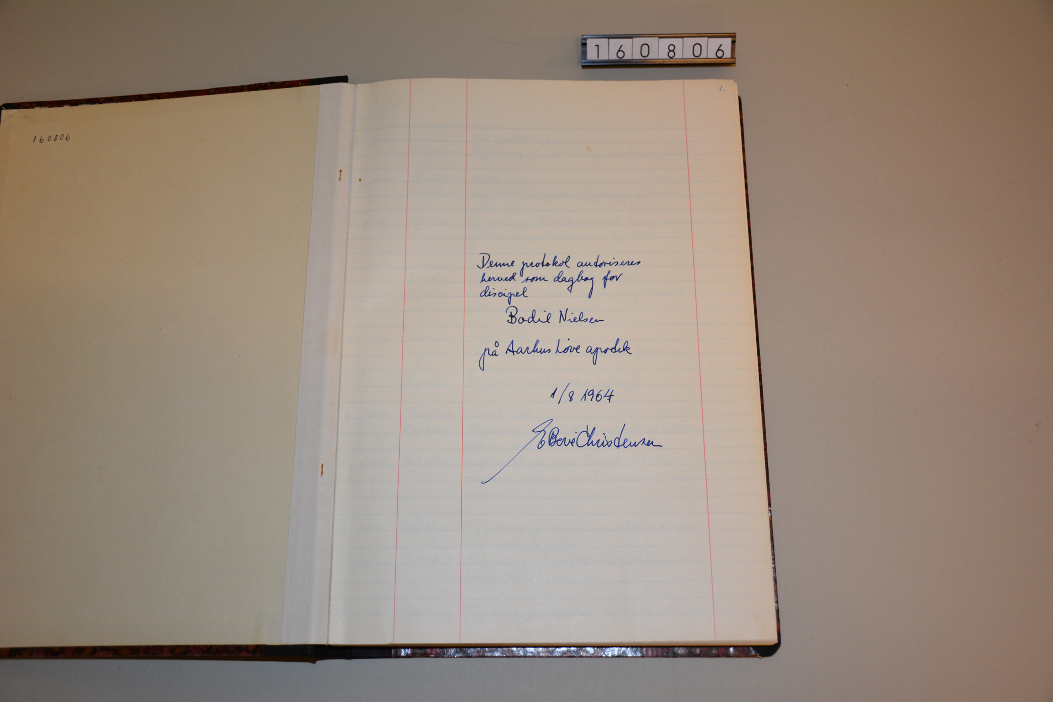 Uddybende oplysninger: "Dagbogen fra Aarhus Løve Apotek er fra 1. august 1964, hvor jeg, Bodil Nielsen (senere gift Brock) begyndte som discipel på Løve Apoteket. Jeg var den første kvindelige discipel på apoteket, da den nytiltrådte apoteker i 1963, Erik Bové Christensen, i modsætning til sin forgænger, ikke havde noget imod at ansætte en kvindelig discipel. Det var et krav, at disciplen førte dagbog under læretiden på apoteket. Dagbogen skulle vurderes i forbindelse med discipeleksamen 2 år efter påbegyndt uddannelse. Uddannelsen som farmaceut/cand. pharm. varede på det tidspunkt fem år, hvoraf de to år var i praktik på et apotek (discipeltiden) og de tre år var på Danmarks Farmaceutiske Højskole i København. Discipeltiden var først og fremmest en oplæring i de forskellige apotekerfag. Det var især lægemiddelfremstilling, som var vigtig på den tid. Størstedelen af sortimentet af lægemidler var fabriksfremstillet, men der var stadig mange apoteksfremstillede lægemidler. Det var et vigtigt beredskab, og apotekerne havde et beredskabslager af de vigtigste lægemiddelstoffer, så en produktion kunne sættes i gang i tilfælde af en krisetid. Disciplen blev derfor oplært i lægemiddelproduktion og skulle kunne kende en række lægemiddelstoffer og sygeplejeartikler. Der var også oplæring i receptekspedition og udlevering af medicinen til kunden. Det var en udlevering, hvor det vigtigste var en udlevering af den korrekte medicin til den korrekte kunde. Kvalitetskontrol var og er stadig meget vigtig på apotekerne. Al håndtering af medicin bliver derfor dobbeltkontrolleret. Der var ingen information om medicinens virkning. Blev vi spurgt, hvad f.eks. Digoxin tabletter blev brugt til, måtte vi ikke fortælle, at det var hjertemedicin, men skulle svare kunden:"Det må De spørge Deres læge om". På Løve apoteket solgte vi også lægeigler, og det var disciplens opgave at skifte vand ved dem. Vi skulle passe på, dels ikke at få dem på huden og dels ikke at efterlade dem på kanten af glasset, så de tørrede ind. I løbet af discipeltiden skulle der samles og tørres planter til et herbarium. Planterne blev indsamlet på Djursland, hvor det var let at finde de 150 planter, som man blev eksamineret i til discipeleksamen." Informant: Bodil Brock om sin discipeltid fra 1964 til 1966 på Århus Løve apotek.
