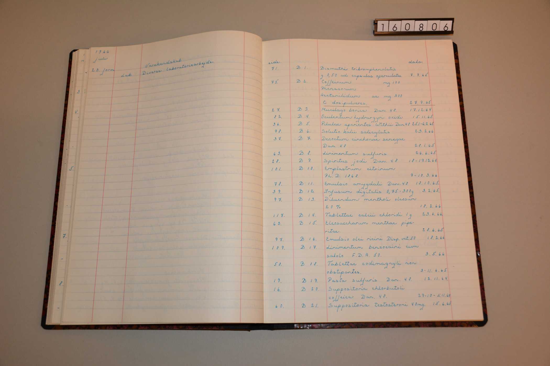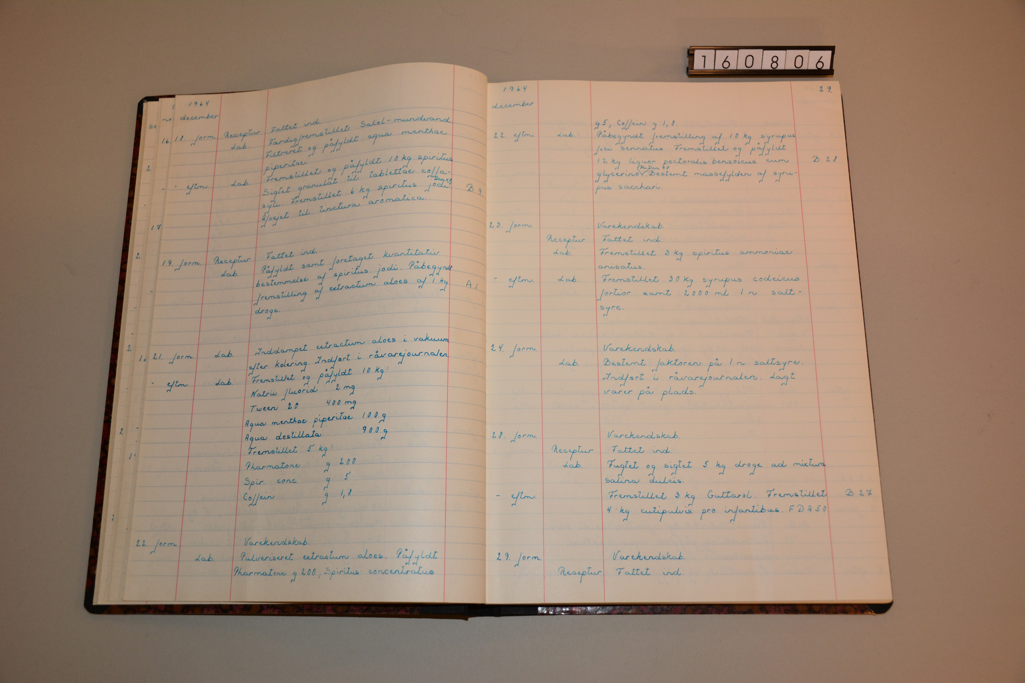 Beskrivelse: "Dagbogen blev omhyggeligt ført, hvor det foruden datoen blev beskrevet hvilken afdeling, man havde været i, samt hvad man havde lavet henholdsvis om formiddagen og om eftermiddagen. De første ca. 3 måneder gik med varerhåndtering og påfyldning af lægemidler. I dagbogen er det beskrevet som fattet ind i recepturen, dvs. hente varer fra lageret og sætte dem på plads i recepturen (afdeling, hvor recepterne blev ekspederede). Derefter var det påfyldning i defekturen (påfyldningsafdelingen) af de lægemidler, som var fremstillet i laboratoriet. Disciplen havde 2 timers frokostpause hver dag, og den blev brugt til læsning, mens man var på apoteket, da det ikke kunne betale sig at cykle hjem til det lejede værelse. Der var ingen ugentlig fridag, og vi arbejdede også lørdag formiddag. Det sidste år fik jeg lov til at få en ugentlig frieftermiddag, mod kun at holde en times frokostpause. Efter ca. en måned på apoteket startede undervisning ved apotekeren i ca. 1 time hver 2. uge. Der var etableret fællesundervisning en aften om ugen for alle disciple fra de aarhusianske apoteker i lovkundskab, kemi og varekendskab. Varekendskab var et fag, der blev eksamineret i til discipeleksamen. Vi skulle kunne kende et stof, en sygeplejeartikel eller et lægemiddel ved sansekontrol, hvor vi skulle se på, smage på og lugte til stoffet. Apoteket havde etableret en vareprøvesamling med tal på de enkelte prøver i samlingen. Vi øvede derfor næsten hver dag flere at disse vareprøver. Efter ca. 3 måneder fik jeg lov til at komme i laboratoriet for at fremstille forskellige lægemidler. I laboratoriet deltog jeg også i kontrol af råvarer samt kvalitetskontrol på de fremstillede lægemidler. Den 23. december 1964 fremstilede jeg f.eks. 30 kg syrupus codeicus fortier (stærk kodeinsaft) samt 2000 ml 1 n saltsyre. Den 24. december om formiddagen bestemte jeg faktoren på 1 n saltsyre og indførte råvarer i råvarejournalen, inden jeg skulle med toget til Odense for at være med familien juleaften. Efter ca. 1 år begyndte jeg at ekspedere kunder i skranken og komme i recepturen for at ekspedere recepter. Bag i dagbogen er der en liste over de lægemidler, som jeg har produceret under min discipeltid. Der er eksempler på forskellige lægemiddelformer, som skulle fremstilles f.eks. spiritus jodi, tablettae codimagnyli non obstipantes, linimentum sulfuris og suppositoria testosteroni. Jeg fremstillede også ældre lægemiddelformer som piller, plastre, trokisker (pastiller) og species (urteblandinger). Den 23. juli 1966 afsluttede jeg dagbogen med en erklæring om, at jeg dagligt havde ført dagbogen korrekt og samvittighedsfuldt, og apoteker Bové Christensen attesterede, at det var korrekt. Dagbogen blev indsendt til eksaminator ved discipeleksamen, og i august måned bestod jeg discipeleksamen på Farmaceutisk Højskole. Sidste del af studiet påbegyndte jeg i København i september 1966." Informant: Bodil Brock om sin discipeltid fra 1964 til 1966 på Århus Løve apotek.