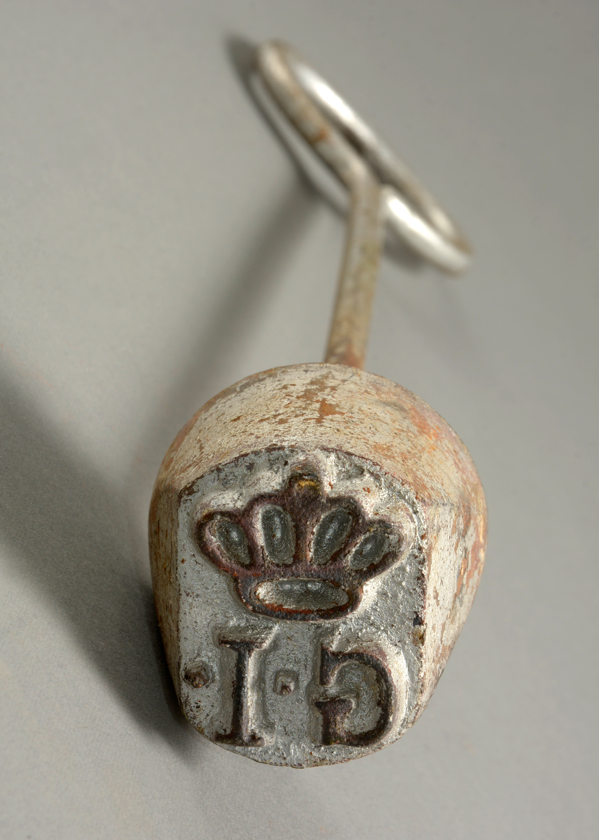 Beskrivelse: Brændejern mærket med krone og GI (Geodætisk Institut).