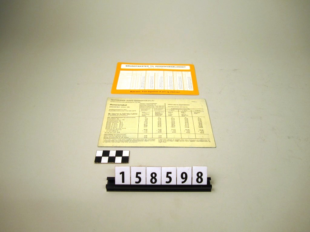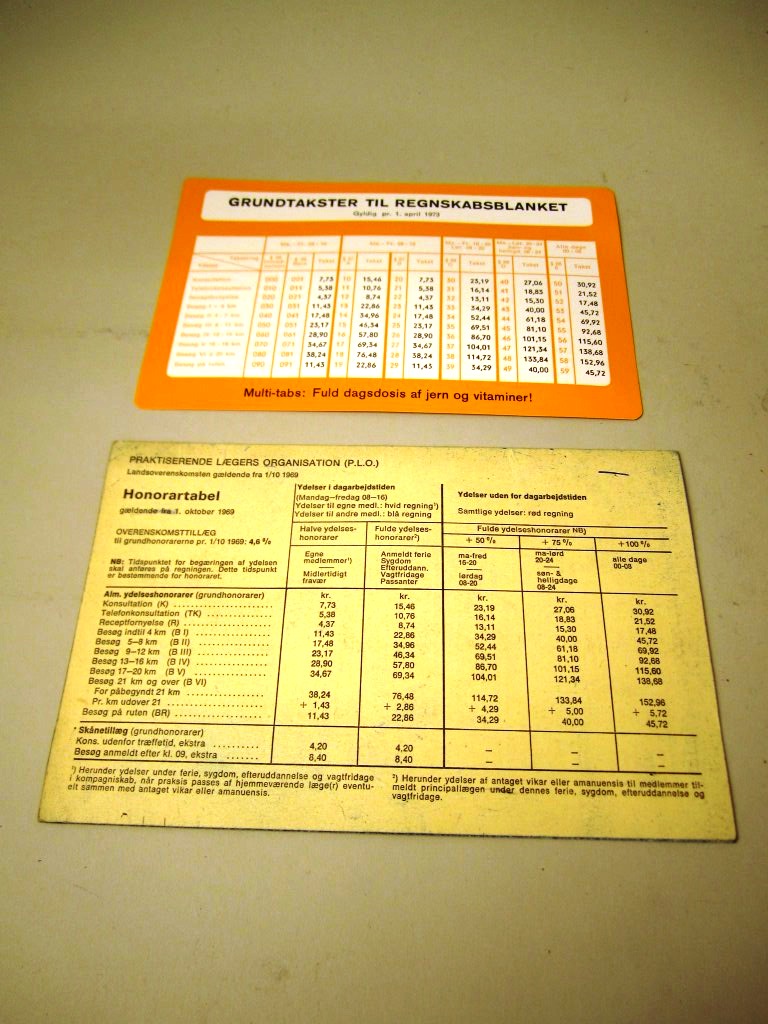 Beskrivelse: Hæfte hvori der står, hvad lægen kan tage for forskellige yderlser, tillægsydelser og laboratorieundersøgelser. Derudover et orange og hvidt stykke papir, hvor der står taksterne til grundydelser, såsom konsultation, telefonkonsultation, receptfornyelse m.v.