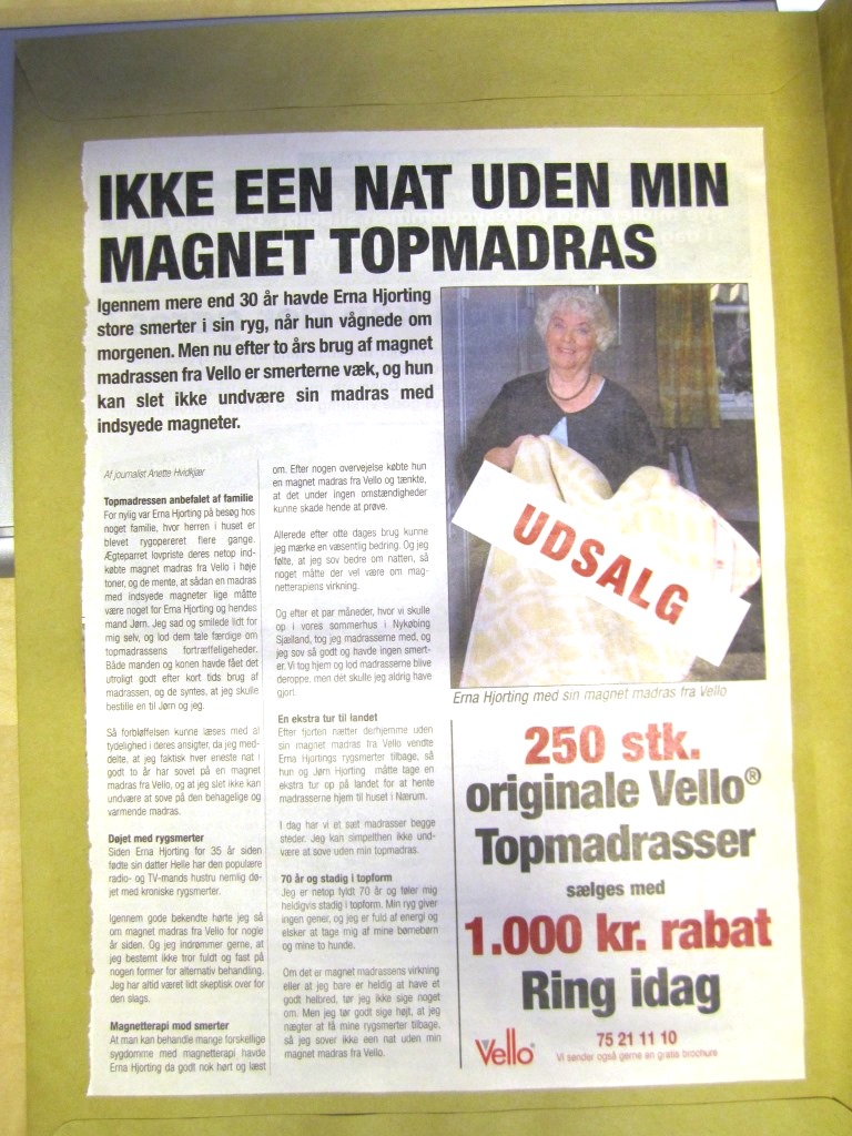 Uddybende oplysninger: Donator fortæller, at hendes moster i 1999 anskaffede en magnetisk topmadras fra firmaet Vello. Prisen var omkring 3000 kr. Madrassen blev anskaffet i håb om, at den kunne mindske led- og rygsmerter, idet hun, mosteren, tidligere havde haft gode resultater af "magnetarmbånd". Efter 3-4 måneders brug uden mærkbart resultat blev tæppet lagt til side og ikke brugt siden.