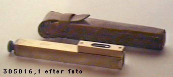 Beskrivelse: Messingrør med kvadratisk tværsnit. Sigtehul og streng. Lille libelle, hvis stand ses under sigtningen.