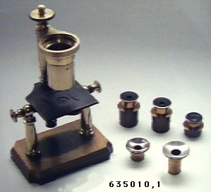 Beskrivelse: Projektionsmikroskop på vippestativ, sådan at mikroskopet kan kippes til vandret. Samlet højde, når mikroskopet er oprejst, 25 cm. Mikropskopet er monteret på grundplade af messing på støbejernsbund. I bunden er denne mærket "635-010, IEVH, , 635-10" samt på lille mærkat "7/10.76, BBB, 150,00." Kuvette af metal med glasbund. Tre løse linser samt to kapper. Transportkasse af mahogni (mål ovenfor). Seddel indlagt i kassen, fransk tekst om forstørringen med forskellige objektiver og okularer på "Microscope à Double Colonne No 3." Mikroskopet blev restaureret i 1969 af P. Therkelsen.