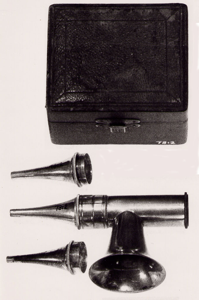 Beskrivelse: Bruntons ørekikkert består af en 7 cm lang metalcylinder med et okular i den ene ende. Midtpå en stor tragt, 4 cm lang, til opfangning af lyset, som ledes via et spejl med hul i midten, mod trommehinden. Tilbehør: tre øretragte 5,5 cm lange. Ligger i trækasse beklædt med sort læder og lærred. Lilla fór.